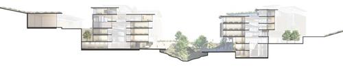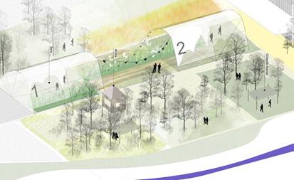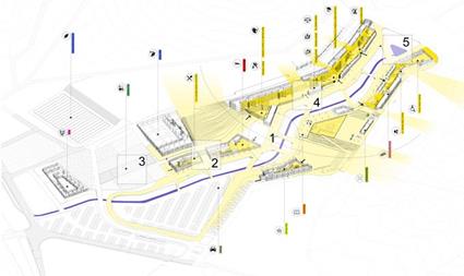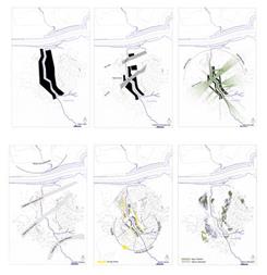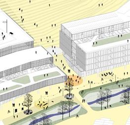 Araç Yolu | çepeçevre yerleşkeyi saran, yapıları dışından besleyen, toplu taşıma ve binek araçlarının kullanabileceği araç yolu, aynı zamanda yerleşkeler arası servis araçları, toplu taşıma hatları için yapılaşma çeperinde ring olanağı sağlayan bütüncül bir ağ olarak düşünülmüştür. Bu yolda, araç ile erişim arka cepheden sağlanmaktadır; bloklara geçişler için durak noktaları, binek araçlar için açık otopark cepleri önerilmiştir.
