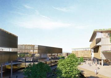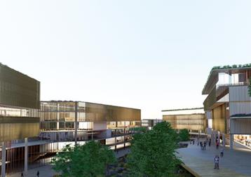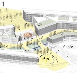 Malzemeler | Bloklar yapım sürecini hızlandırmak, yatırım ve bakım maliyetlerini en aza indirmek amacıyla sıva, boya gibi katmanları kaldırarak, kuru sistemin getireceği yalın, net etkili iç ortamlar olarak tasarlanmıştır. Taşıyıcı sistem malzemesi brüt beton, yapıyı hafifletmek, yapım sürecini hızlandırmak için dolu ve şeffaf yüzeyli modüler bölücü duvar elemanları, akustik ses kontrolünün gerektiği mekanlarda ahşap asma tavanlar önerilmiştir. Zemin kaplamalarında iç mekanlarda perdahlı beton yüzey üzerine beton sertleştirici ve epoksi uygulanmış yüzeyler düşünülmüştür. Dış mekan yürüme, araç yolları ve açık otopark alanları, geçirgen/yeşil beton önerilmiştir.