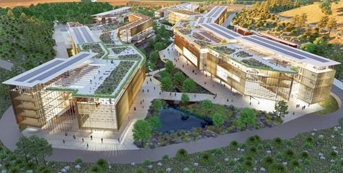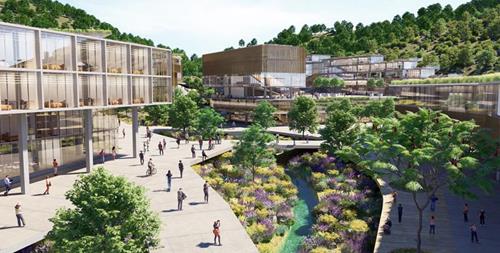 Bu kapsamda kendi enerjisini üreten çatı bahçeleri, tarım alanları yaratılmıştır. Yere ait doğal mevcut veri -dere referans alınarak kuru dere ve çevresi yeşil bir vadiye dönüştürülmüştür. Yerleşke yaşantısı doğal jenerik elemanın çevresinde ve sıkı ilişkide kurgulanmıştır. Binek araçları açık otopark alanı üzerinde güneş tarlaları önerilmiştir. Eko|alle (dere ekseni/yeşil vadi) güney ucunda yağmur suyunun toplandığı GÖLET oluşturulmuştur. Sulama amaçlı yağmur suyu hasadı, binalarda gri su kullanımı, zeytin ve maki alanlarını koruyarak biyoçeşitlilik'in güçlendirilmesi, sıfır atık politikasıyla geri dönüşüm mekanları kurgulanması, dış mekandaki sert zemin yüzeylerin geçirgen beton ile kaplanması önerilerek sürdürülebilir bir yeşil yerleşke tasarlanmıştır.