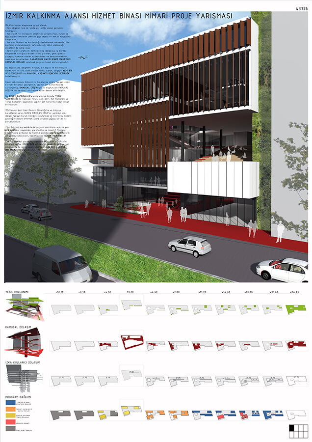 Yılın 3/4’ünü dış mekânlarda geçiren İzmirlilerin, KAMUSAL BOŞLUK etrafında gelişen KENTSEL PROMENAD boyunca uğrayacakları açık ve yarı açık mekânlar sayesinde, binanın içine girmeden de yaratıcılığa ve inovatif fikirlere tanıklık edebilecekleri, İZKA’nın yaratacağı dinamizmi deneyimleyebilecekleri kesintisiz bir DÜŞEY KAMUSALLIK üretilmek istenmektedir. Bu DÜŞEY KAMUSALLIK’a eşlik edecek biçimde YEŞİL SÜREKLİLİĞİ de Kamusal Teras, Açık Amfi, Kat Bahçeleri ve Teras Bahçeleri sayesinde yapının üst katlarına kadar devam ettirilmiştir.