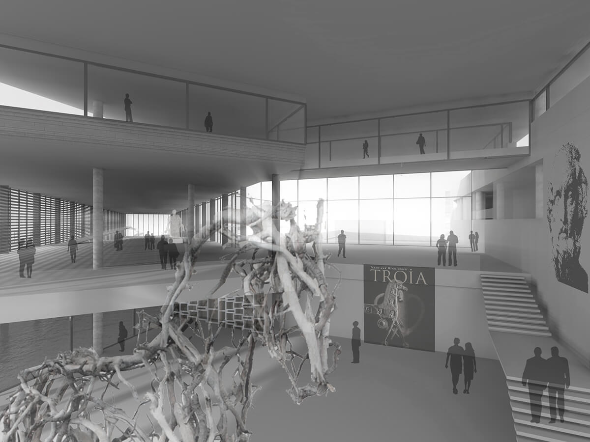 5000 yıllık geçmişi lan yer'in farkıl kotlarda, tarihsel katmanlarda algısını çoğaltarak, perspektiflerini zenginleştirerek gezdirmek. Yer'in tarihi ve doğal zenginliğini yatayda köprü-patika ile düşeyde ise kule bina yoluyla sergilemek. Yerleşkedeki gezintiyi, Truva ören yeri ve Tevfikiye Köyü'nün sokakalarında gezergibi kıvrılarak, dönerek, binaların arasından, yeşilin içinden geçerek deneyimlemek.